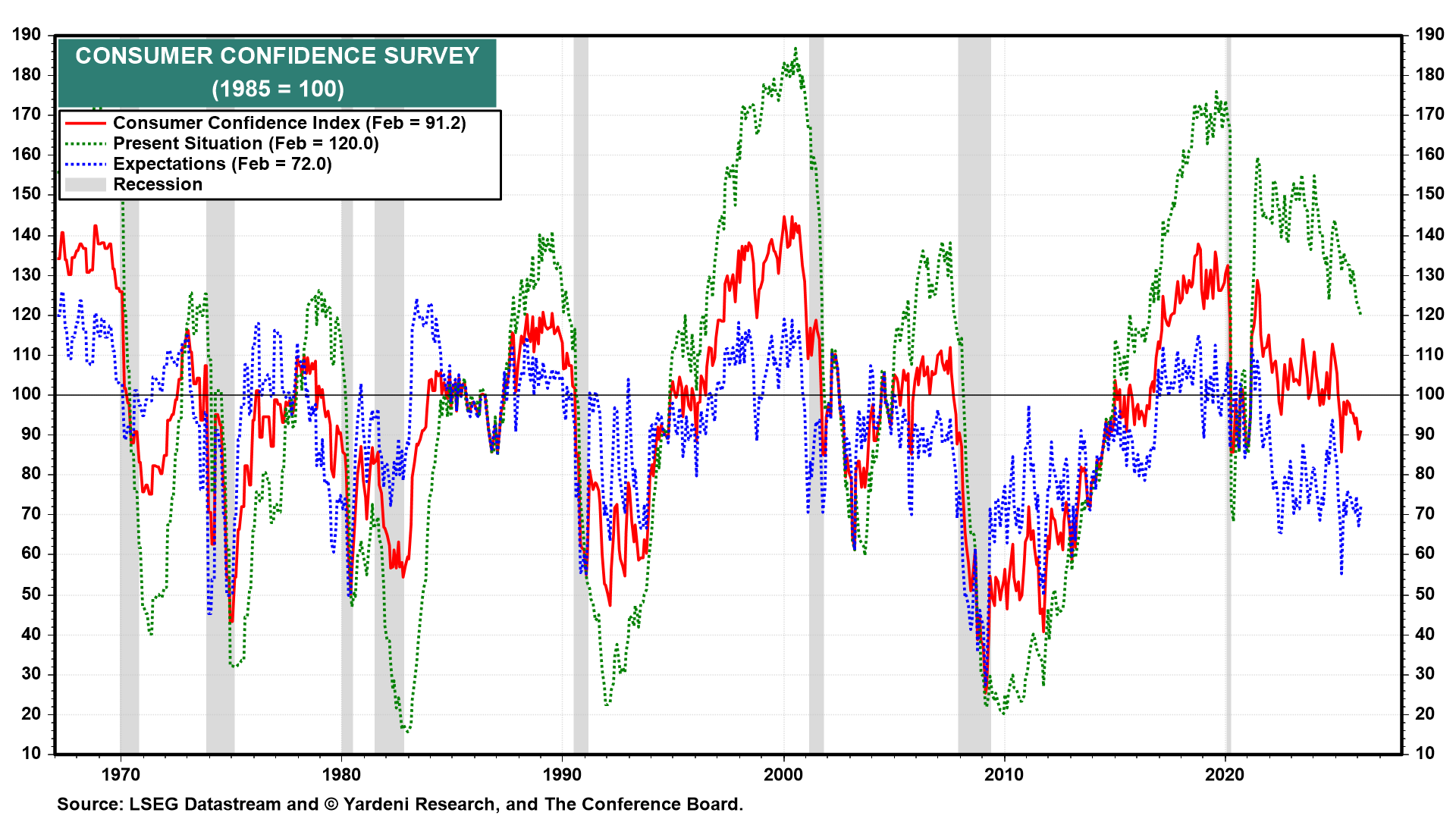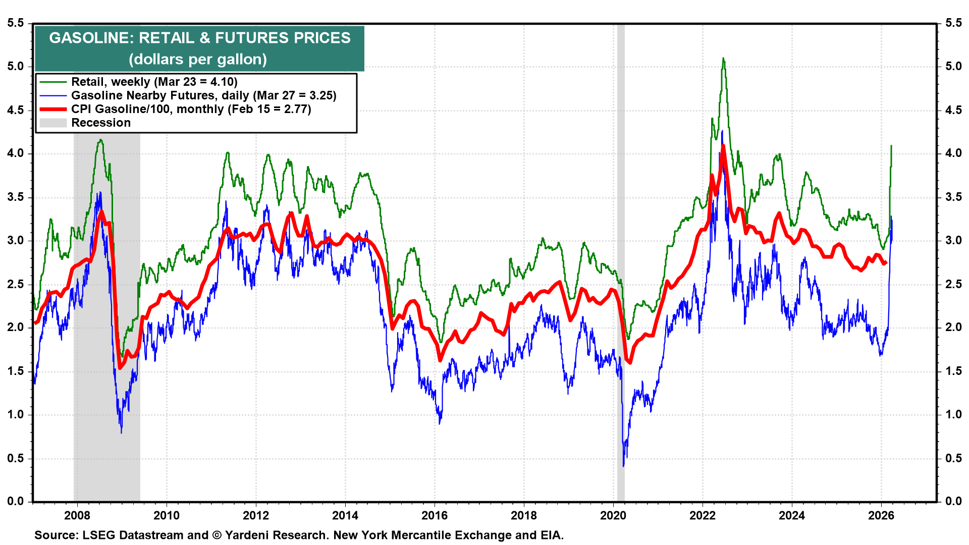 (2) Consumer confidence. Consumer confidence will be closely watched this week as one of the first numbers to gauge how rising electricity prices are affecting households. National gasoline prices rose from $2.98 on February 26 to $4.10 per gallon on March 23, an increase of about 38% that could weigh on consumer sentiment (chart).
