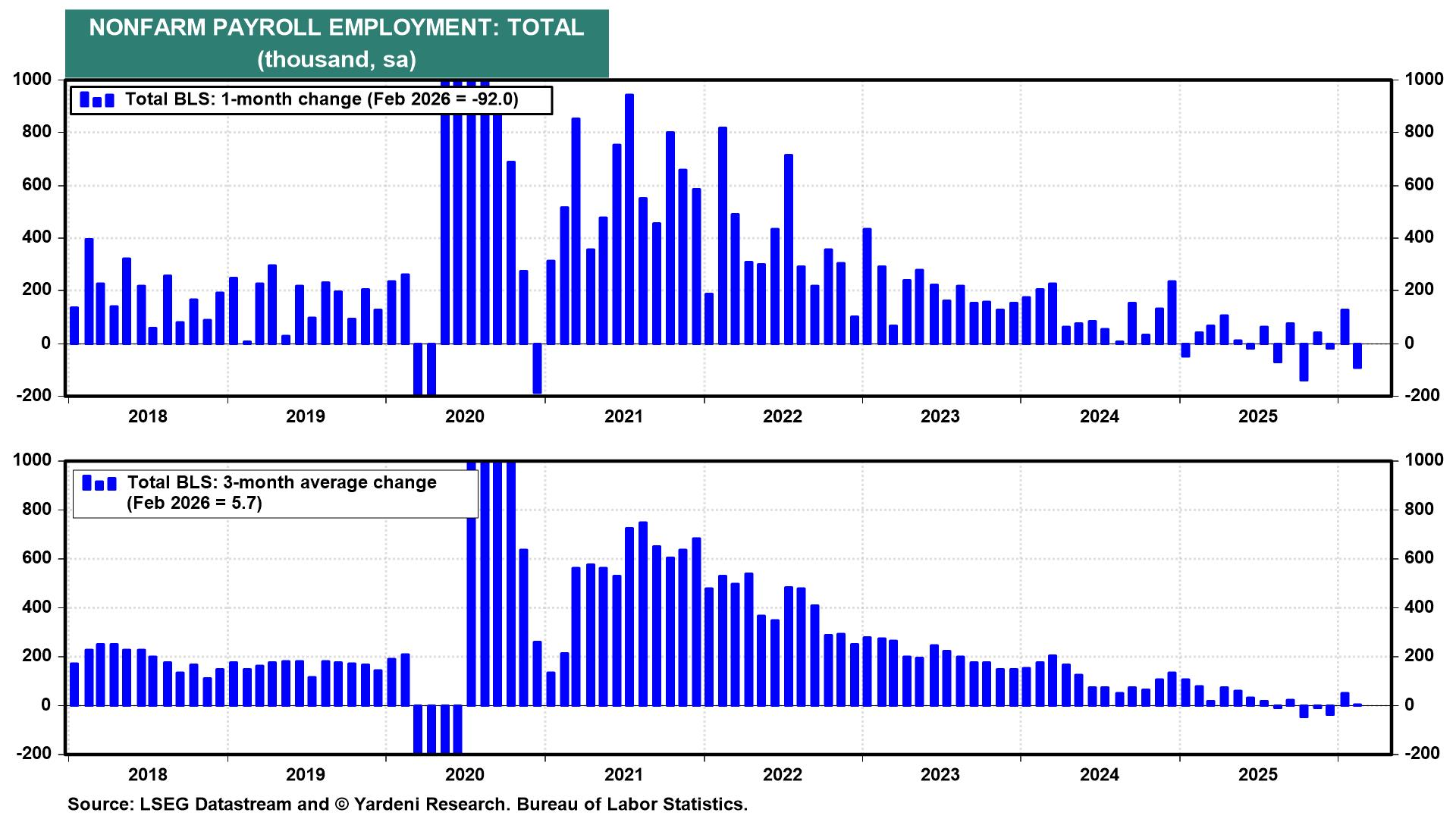 (1) Work. The March (Friday) payrolls report will have added significance after February’s unexpected drop of 92,000 and a rise in the unemployment rate to 4.4%. Bloomberg’s median estimate is for an increase of 60,000, and no forecasters expect job losses, suggesting that the labor market remains strong despite the low levels. We will also receive additional signals from ADP (Wed), Challenger (Thu), and weekly unemployment reports (Thu), which should help clarify whether February’s weakness was a one-off or the start of a larger decline.
