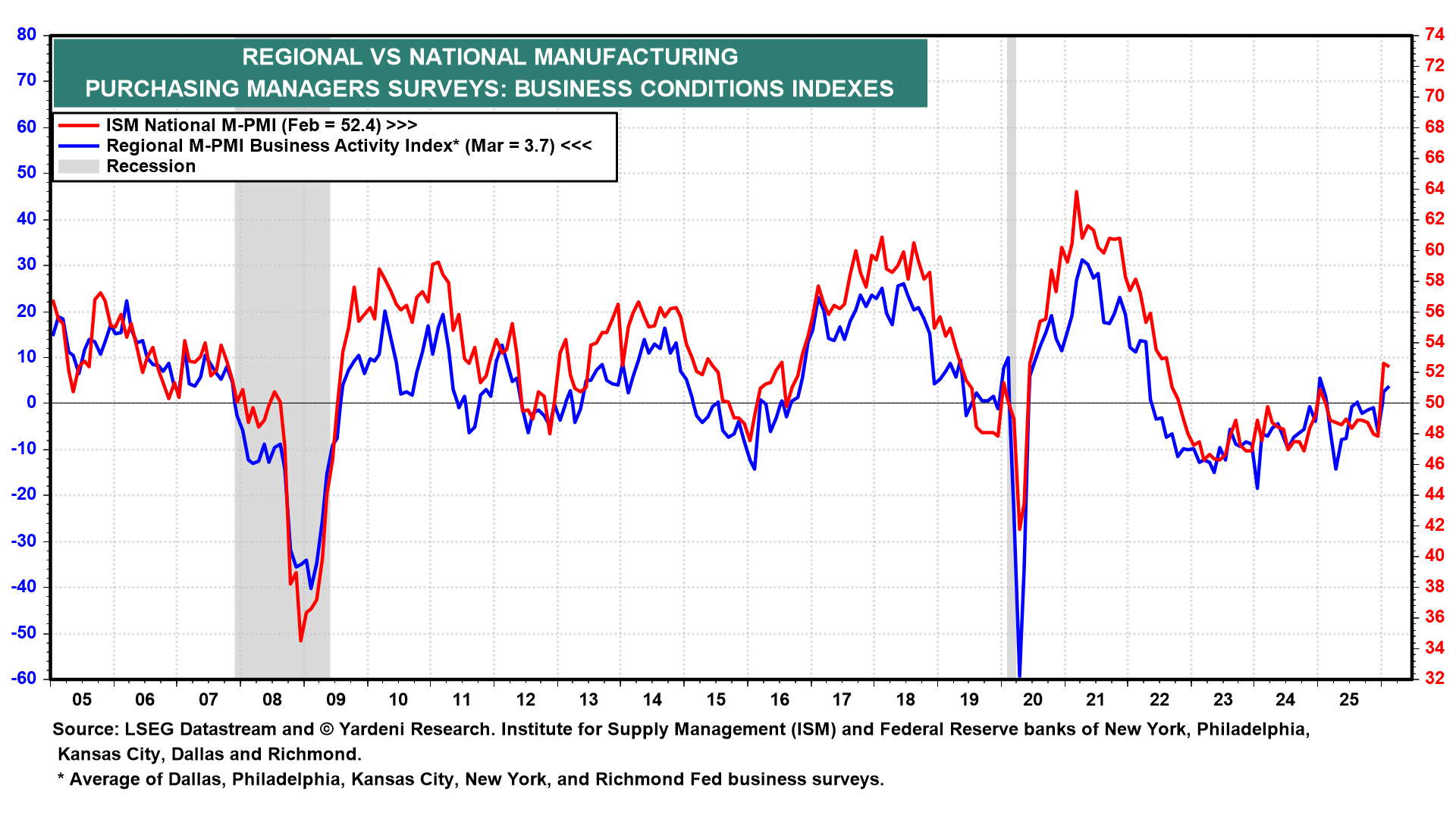(3) PMIs. Manufacturing data will be in focus this week, with the Chicago PMI, final S&P 500 PMIs, and ISM output due. With uncertainty raised by rising oil prices and the Fed’s policy buying, forward-looking sectors will be important. The regional survey for March remained soft in relation to the expanding ISM, highlighting the difference between the weak regional performance and the national reading (chart). If the ISM begins to converge to a lower number of regions, it may suggest that the development of production is losing momentum after a period of stability.