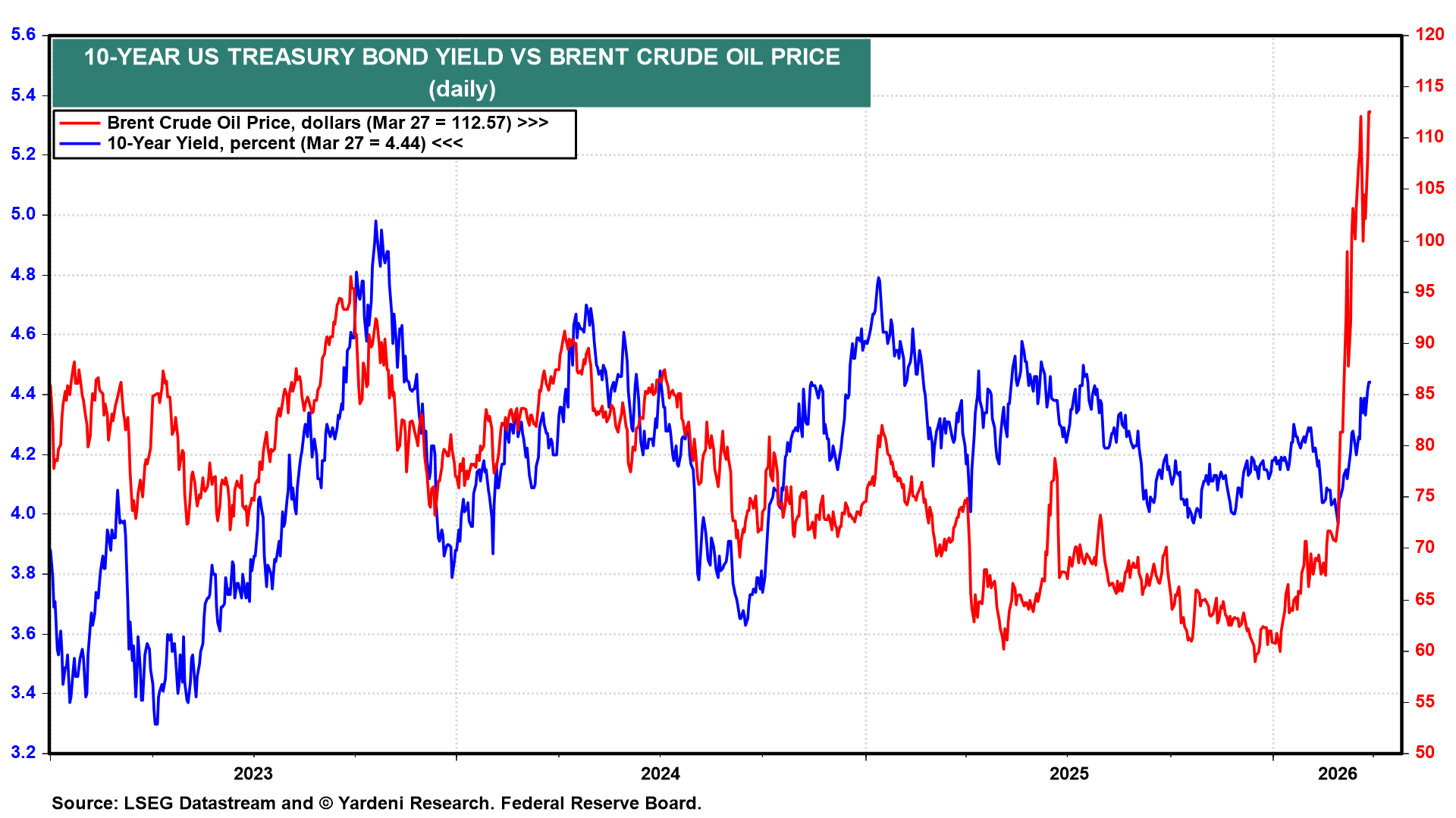 Oil markets have responded accordingly. WTI closed at $99.64 a barrel, up 18.7% from Tuesday’s low of $83.96 and marking its highest weekly close since the conflict began, while Brent ended at $112.57, up 16.6% from its weekly low of $96.52 (chart). The speed and magnitude of the move make it clear how quickly energy markets are reacting to environmental risk, challenging earlier efforts to keep oil and bond markets stable, and heightening the risk of further disruption in the Strait.